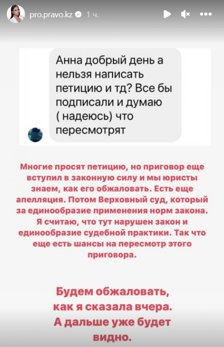 "Многие просят петицию, но приговор еще не вступил в законную силу, и мы, юристы, знаем, как его обжаловать. Есть еще апелляция. Потом верховный суд, который за единообразие применения норм закона. Я считаю, что тут нарушен закон и единообразие судебной практики. Так что еще есть шансы на пересмотр этого приговора. Будем обжаловать, как я сказала вчера. А дальше уже будет видно", - написала Анна Чернова в сторис своего Instagram.