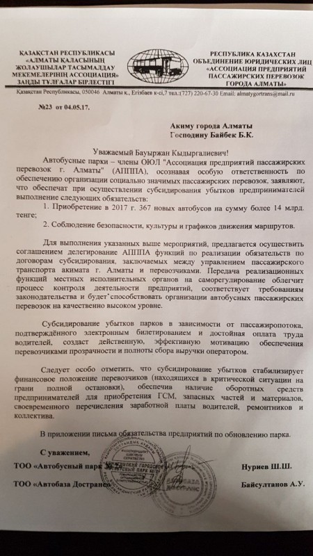 "Мы дали гарантии. Каждый из перевозчиков подписал, поставил свою печать. Мы обязались приобрести новые 367 автобусов на 14,6 миллиарда тенге. Отмечу, что при субсидировании еще три миллиарда тенге возвращаются в виде налогов. Мы дали гарантию, что берем на себя обязательства саморегулирования организации пассажирских перевозок. Это значит своевременное техническое обслуживание, ремонт, контроль на линии, медицинский осмотр, повышение квалификации водителей, то есть полный комплекс задач по организации пассажирских перевозок. Мы говорим, что это будем делать за свой счет, сами. Представили проект договора, в котором это указали. А акимат будет вести контроль", - пояснил президент ОЮЛ "Ассоциация предприятий пассажирских перевозок города Алматы" Сабит Аманбаев.