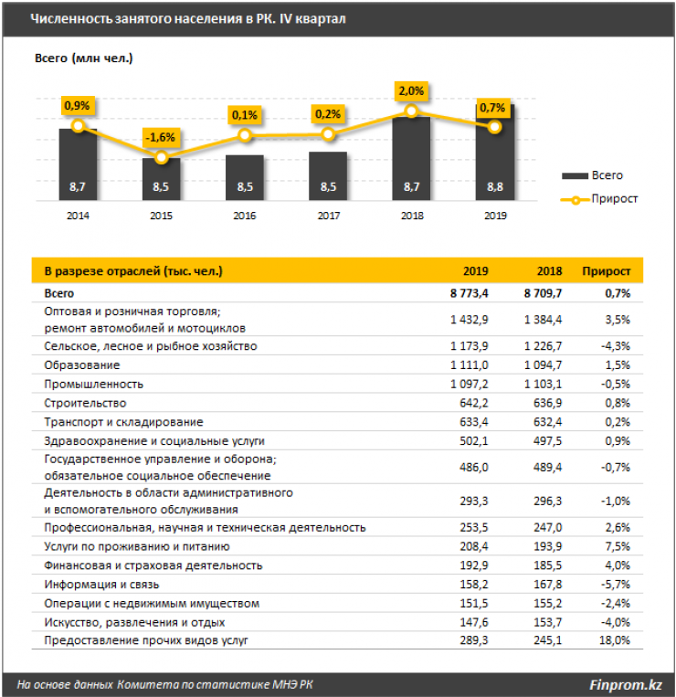 Аналитики отмечают, что в четвертом квартале 2019 года численность занятого населения составила 8,8 миллиона человек, это рост на 0,7 процента за год. Заметнее всего количество занятых казахстанцев увеличилось в столице: годовой рост составил 9,2 процента до 553,6 тысячи человек. В Атырауской области число занятых выросло на 4,1 процента, в Алматы - на 2,9 процента.