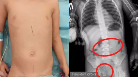 "Проведена колоноскопия, и из сигмовидной кишки удалена последняя игла, которая концом была зафиксирована в слизистую кишечника. В настоящее время ребенок в удовлетворительном состоянии выписан домой", - сообщили врачи.