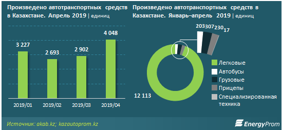 Всего за январь-апрель 2019 года было произведено 12,87 тысячи автотранспортных средств, рост за год составил 39,2 процента. Из них более 94 процентов - легковые автомобили: 12,11 тысячи, что на 37,9 процента больше по сравнению с январем-апрелем 2018 года. Грузовых автомобилей было произведено 307, автобусов - 203, прицепов - 230, специализированного автотранспорта - 17 машин.