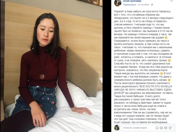 "На границе стояли в очереди 2 часа, так как приехали на своей машине как дураки. Оказывается, нужно было приехать на такси и пройти контроль пешком, а там снова сесть на такси. Учитывая то, что поехали мы с маленьким ребёнком, нервы начинали потихоньку сдавать, от волнения и мыслей о том, что мы опоздаем на рейс, хотелось и плакать, и смеяться. В отличие от сына, я не плакала, зато смеялась громко. Спасибо Косте за то, что своей сдержанностью он создавал баланс. Когда мы все-таки дошли до контроля, оказалось, что без загранпаспорта Таира никуда мы вылететь не сможем. В этот момент мы с Костей впервые узнали, что даже у семимесячного ребёнка должен быть загран. После некоторого времени полного смятения и моего решительного "ВСЁ КОСТЯ ЭТО КОНЕЦ Я НИКУДА НЕ ХОЧУ НИКАКУЮ ВЫСТАВКУ ЕДЕМ ДОМОЙ" мы решились на невозможное: оставить Таира Костиной бабушке", - написала девушка (орфография и пунктуация сохранены).