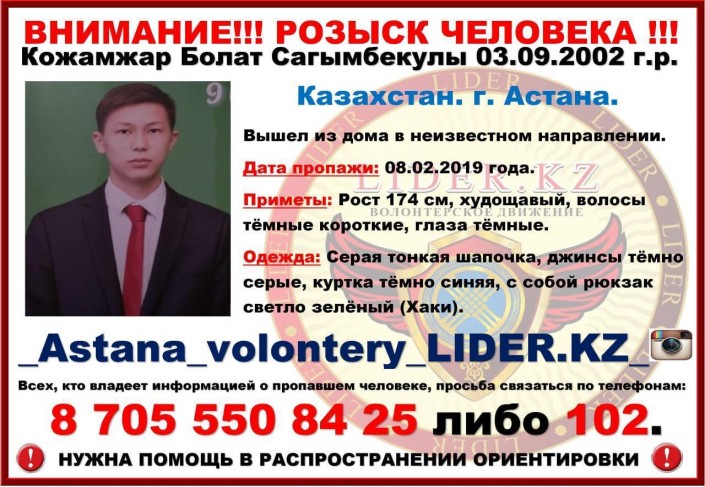 В пресс-службе Департамента полиции Астаны сообщили, что по факту пропажи школьника полицией проводятся розыскные мероприятия по установлению местонахождения Болата Кожамжара.