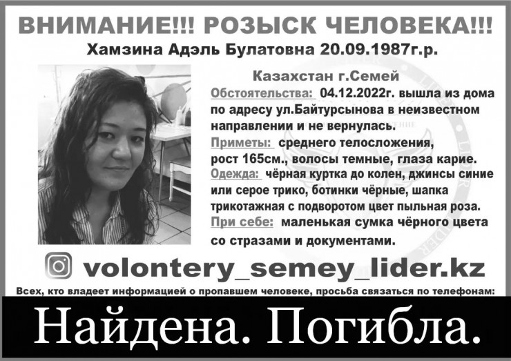 Было известно, что семейчанка вышла из дома по улице Байтурсынова 4 декабря и больше не возвращалась. Поиском занималась полиция и волонтеры. 8 декабря волонтерская организация Lider.kz на своей странице в социальных сетях сообщила о том, что пропавшая Хамзина Адэль Булатовна найдена погибшей.