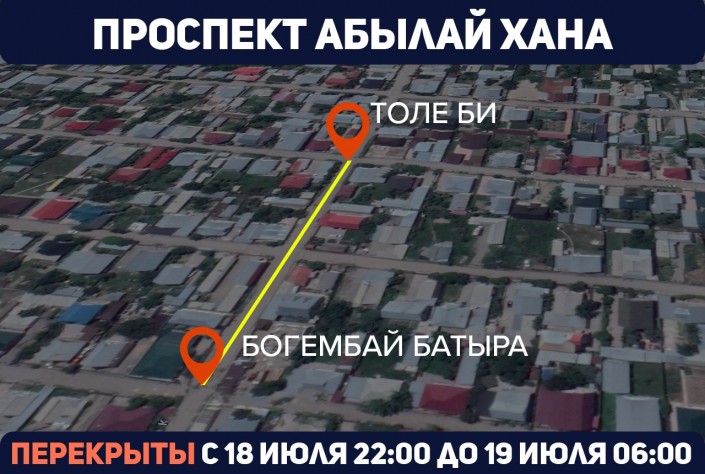 Кроме того, дорожные работы будут проводить на отрезке от улицы Богенбай батыра до улицы Толе би. Движение будет перекрыто с 22.00 18 июля до 06.00 19 июля.