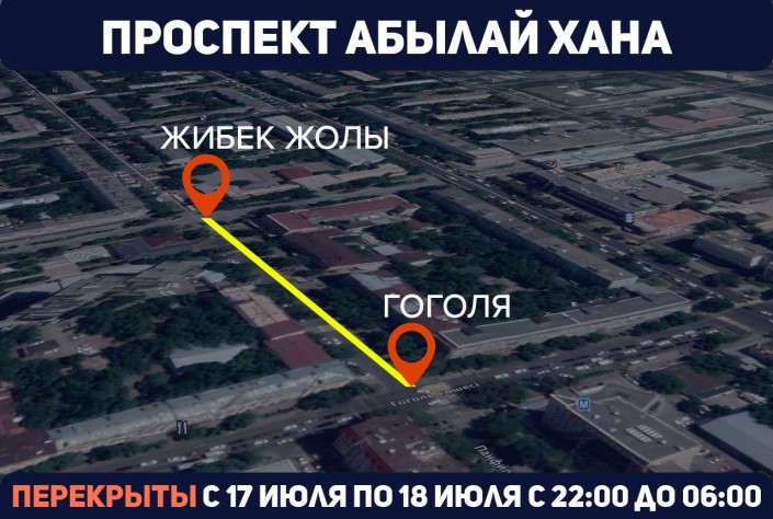 А также участок проспекта от улицы Гоголя до проспекта Жибек жолы (с 22.00 до 06.00 17-18 июля).