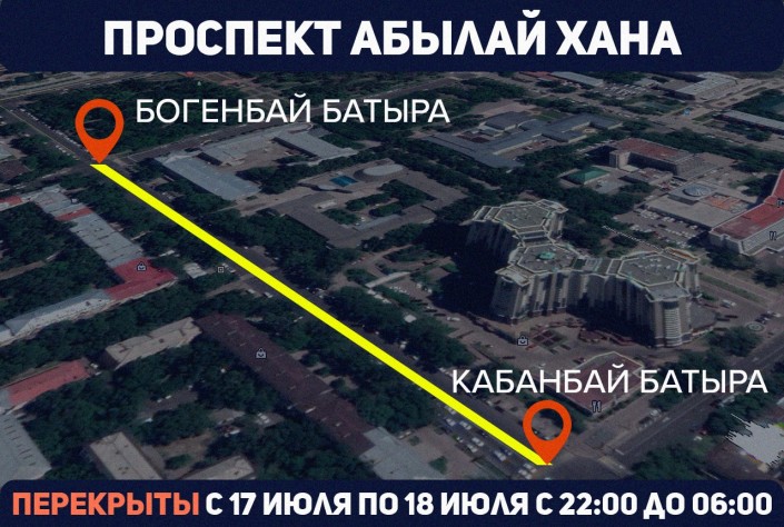 Это участок проспекта Абылай хана от улицы Кабанбай батыра до улицы Богенбай батыра (с 22.00 до 06.00 17-18 июля).