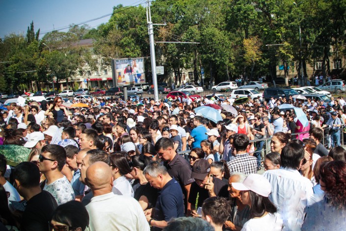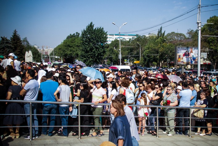 В 9 утра по проспекту Абая идут люди с цветами. В одиночку, семьями, с маленькими детьми, колясками, самокатами. Большинство отказались от автомобилей, предположив, что будут сложности с парковкой. Официально прощание начнется в 10.00, однако в некоторых источниках указывалось другое время - 09.00. Те, кто пришел раньше, окажутся по-своему правы: далеко не все смогут попасть внутрь дворца спорта имени Балуана Шолака.