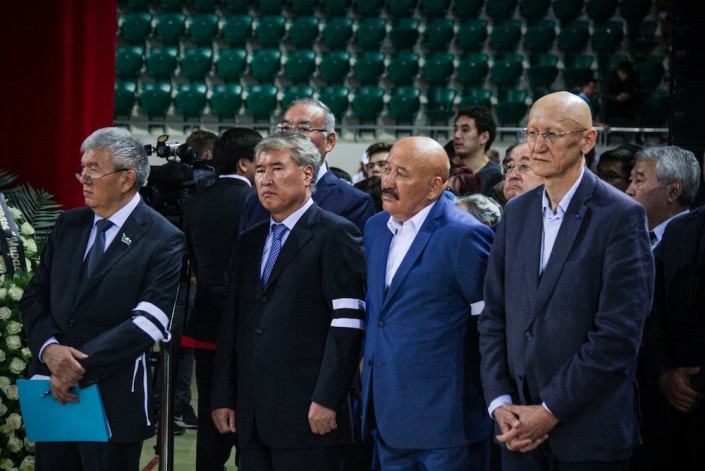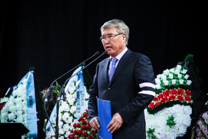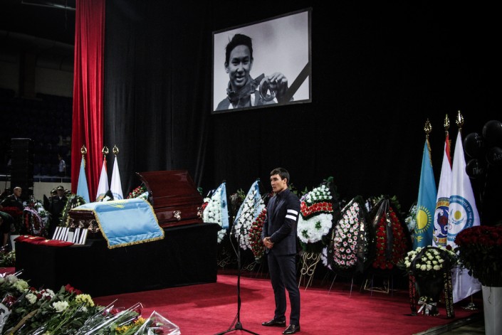 Говорит министр культуры и спорта Арыстанбек Мухамедиулы. Он зачитывает телеграмму от имени Нурсултана Назарбаева, которая ранее была передана родителям Дениса. Телеграмму от имени акима Алматы Бауыржана Байбека зачитывает его заместитель.