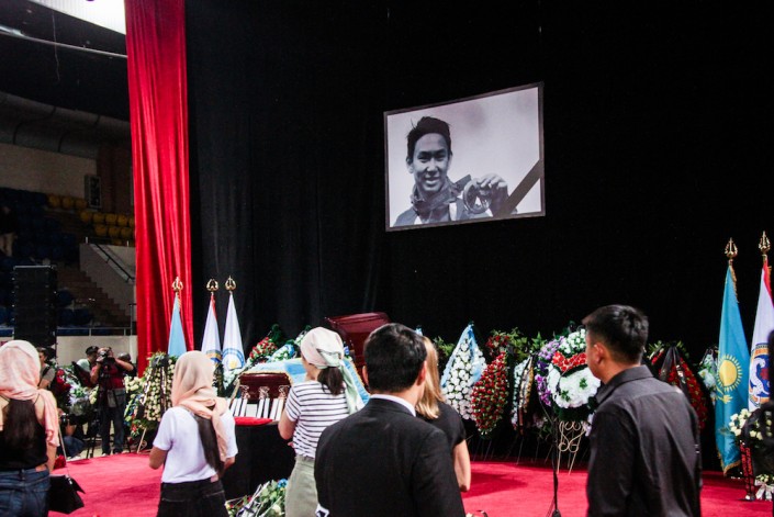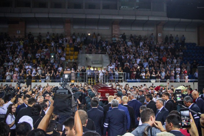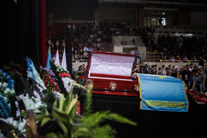 На полу дворца спорта красная ковровая дорожка. Играет музыка, написанная Денисом. У южного края зала на постаменте стоит гроб, накрытый казахстанским флагом. Верхняя крышка открыта.