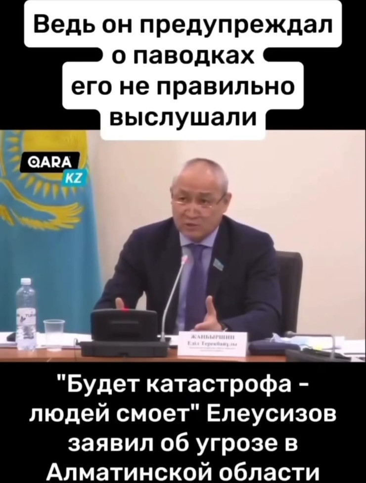 "Но он там не говорил о паводках, которые у нас сейчас на западе и севере. Он рассказал о проблеме в Алматинской области, об озере Балхаш. Но о нынешней паводковой ситуации речи не шло. Здесь вырезали ту часть, где я делаю предупреждение, и сделали из этого хайп. На самом деле он (Елеусизов - прим.) говорил не один, а два раза. Один раз - 7 минут и другой - 5 минут. У него было достаточно времени, чтобы выступить, на него никто не давил. Просто вырезали эту часть и сделали хайп", - добавил Жанбыршин.
