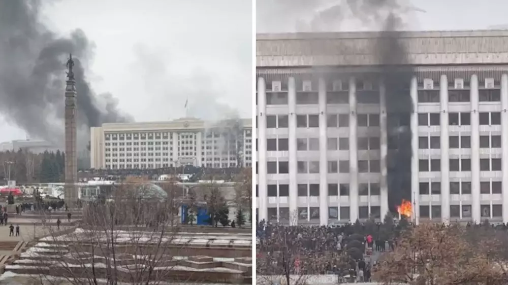 В соцсетях сняли кадры беспорядков в районе акимата Алматы. По сообщению очевидцев, толпе удалось прорваться к городскому акимату, от здания виден черный дым.