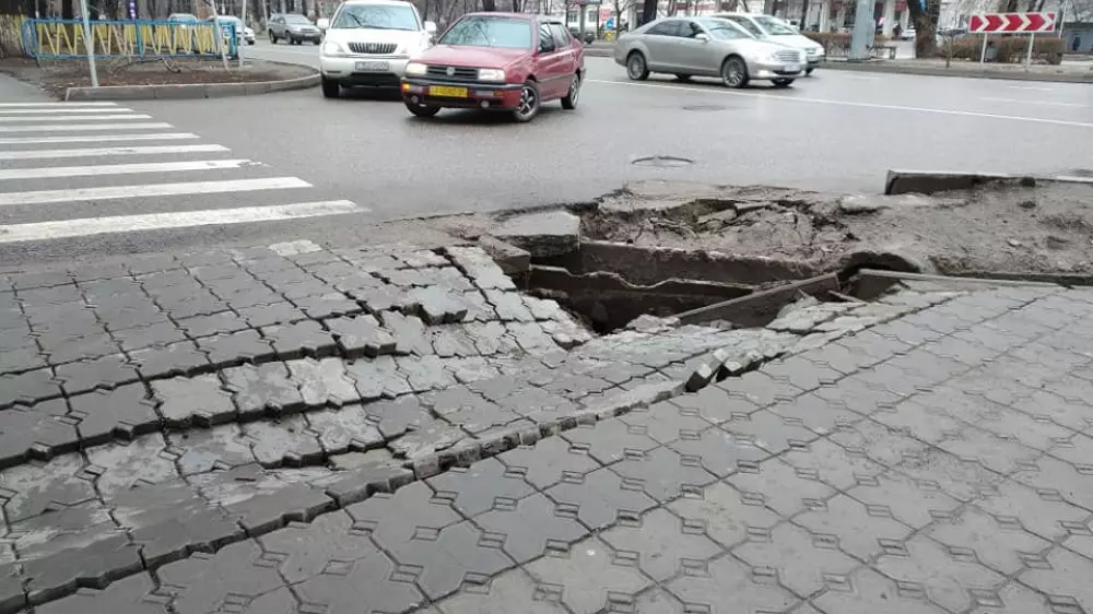 "Провал через весь тротуар появился на проспекте Абая, южная сторона улицы Биокомбинатская. С его края земля ощутимо оседает под ногами, как бы кто-нибудь туда не провалился, ходите осторожнее", - написала алматинка в Facebook.