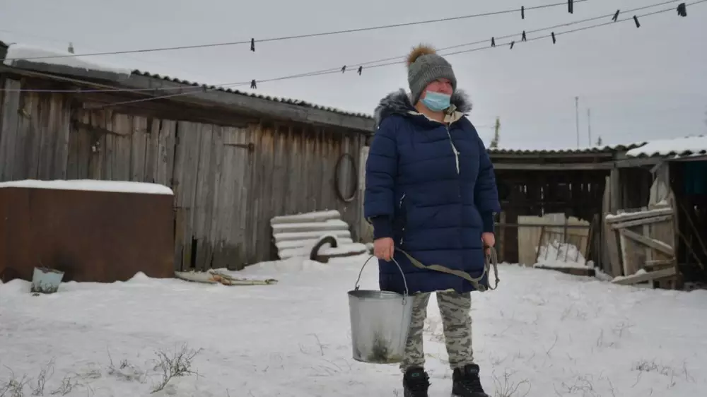 Одна из жительниц показала, как она решает проблему с нехваткой воды: выходит во двор, зачерпывает ведром снег и ставит топиться на печку.