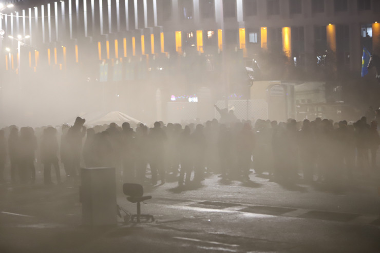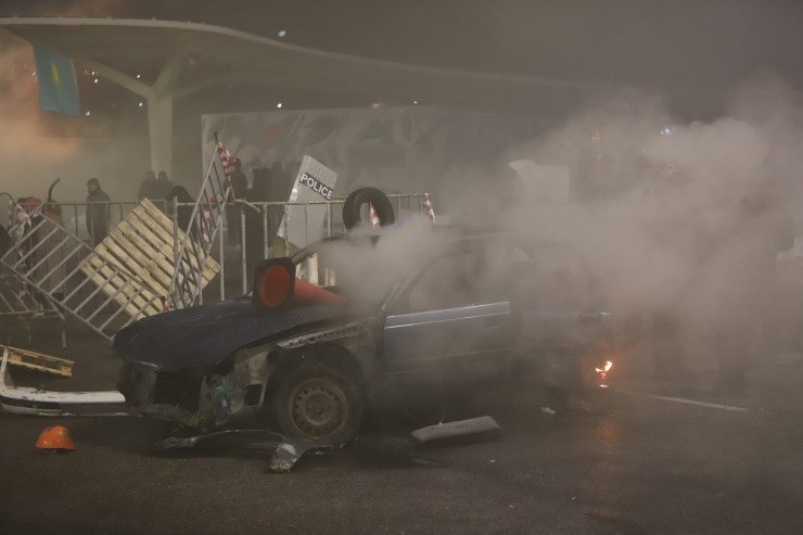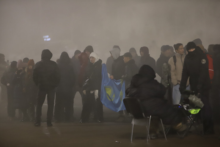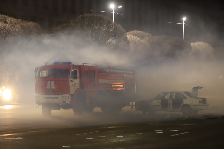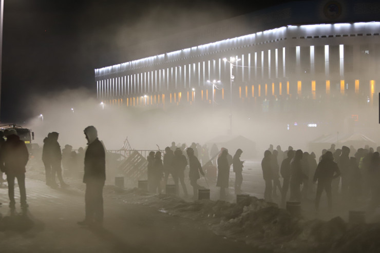 Площадь заволокло густым дымом. Тут и там перевернутые машины. В центре стоит толпа людей и скандирует лозунги. По бокам горит огонь. Со стороны может показаться, как будто события ночи с 4 на 5 января 2022 года повторились вновь. Этого эффекта и добивались авторы картины.