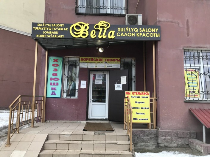 Салоны красоты (sulýlyq salony), магазин бытовых товаров (turmystyq taýarlar) и корейской косметики (koreı taýarlary), ломбард (lombard) расположены в одном помещении в Наурызбайском районе.
