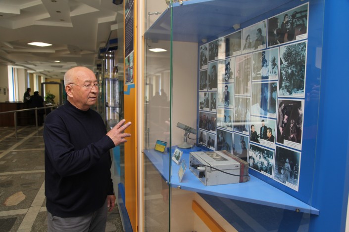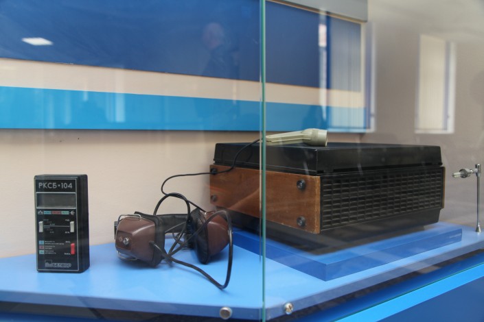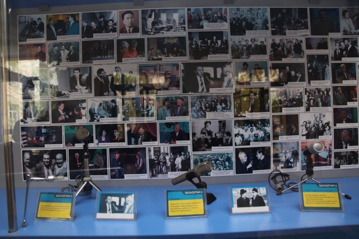 "Бұл 1970 жылдары қолданылған МД-54 микрофоны. Әкем бұл микрофонмен тікелей эфирде мәтін оқыған. МД-12 деген кішкентай микрофон да болды. Оның алдында қолданғандары, өкінішке қарай, қазір жоқ. Бәрін таратып алып кеткен. Бұлар - қалғаны, қолдан жинағанымыз", - дейді ардагер инженер, Ә.Байжанбаевтың ұлы Арыс Байжанбаев сөредегі микрофондарды нұсқап.