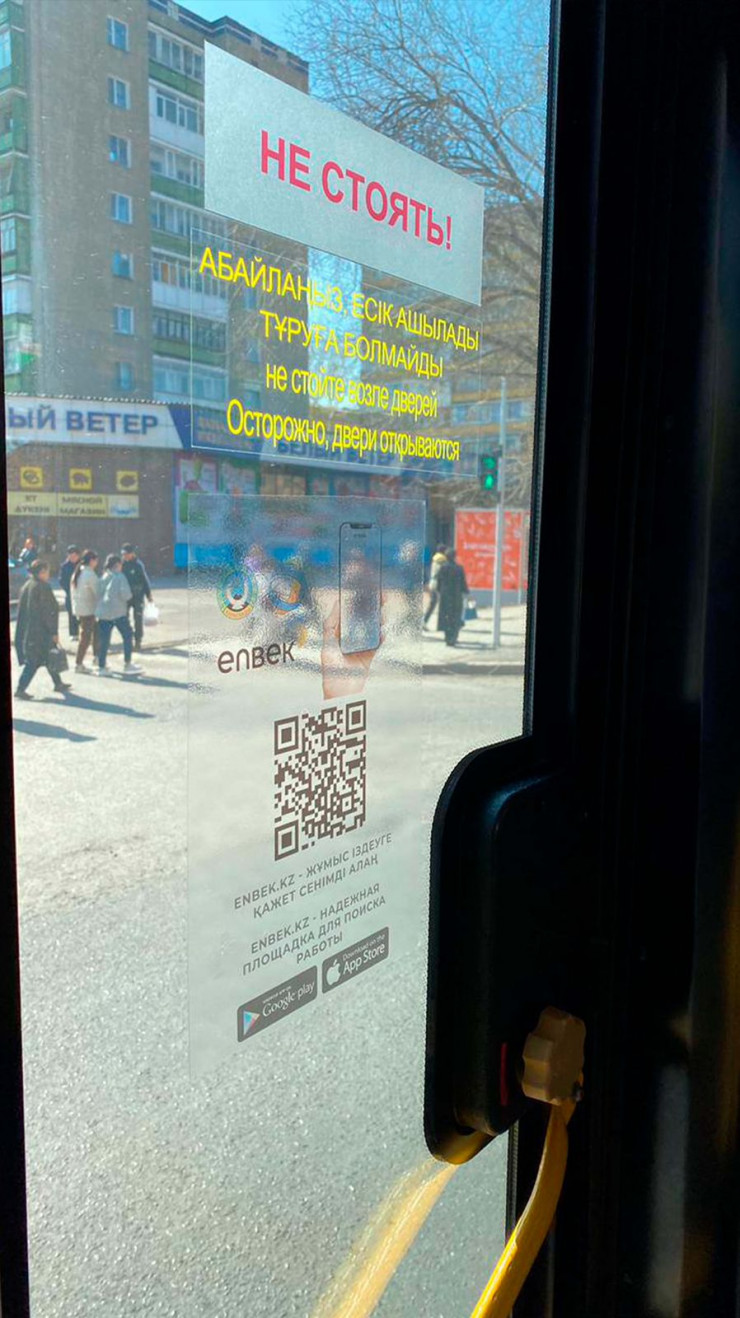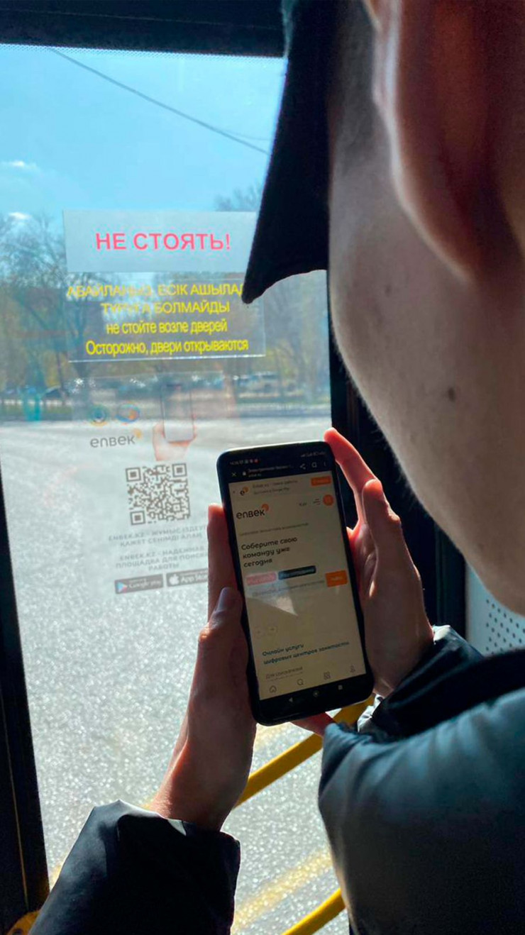 "Мы разместили QR-коды в 40 автобусах шести городских маршрутов для массового охвата людей. Пройдя по ссылке на портал Enbek.kz, безработные могут найти работу, оставить резюме, подать документы на выплату по потере работы, заявление на переобучение, узнать о возможности получения гранта, – рассказывает руководитель Центра занятости населения Караганды Нуржан Сыздыков. – Также там размещена информация о проектах "Молодежная практика", "Контракт поколений", "Первое рабочее место", "Социальное рабочее место", "Общественные работы", "Серебряный возраст".