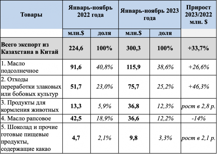 Основные товары экспорта пищевой промышленности из Казахстана в Китай: