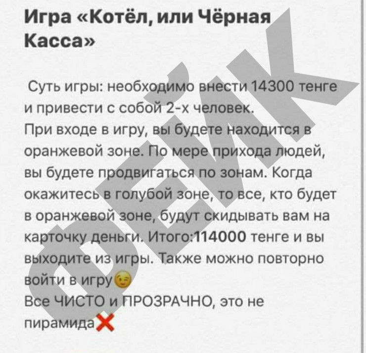 На тему рассылки высказались в Ассоциации финансистов Казахстана. В АФК отметили, что согласно 217-й статье Уголовного кодекса, в данной игре присутствуют основные признаки финансовой пирамиды, такие как: