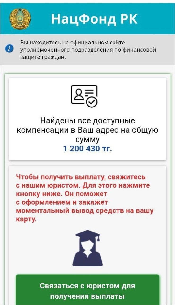В социальных сетях распространяют рассылку о выплате казахстанцам компенсаций из Нацфонда. Она является фейковой и ведет на мошеннический сайт, передает Tengrinews.kz со ссылкой на Stopfake.kz.