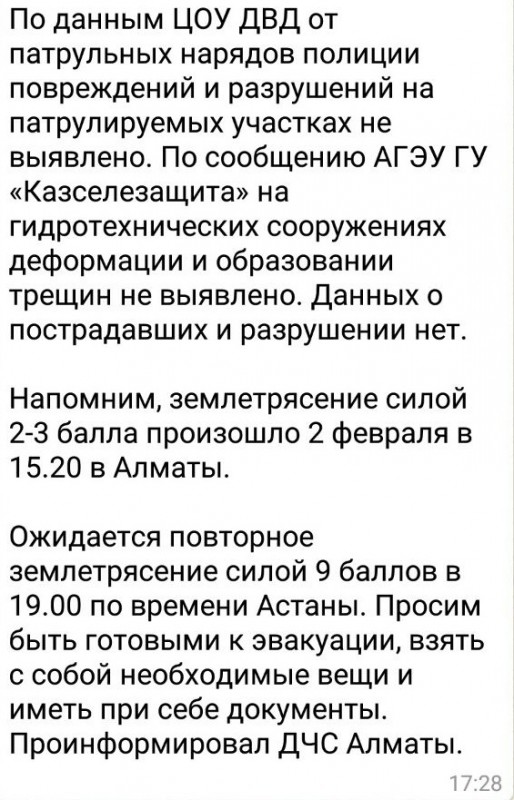 В сообщении говорится, что в 19.00 по времени Астаны ожидаются повторные подземные толчки силой 9 баллов. Жителей просят быть готовыми к эвакуации, взять с собой необходимые вещи и документы. Отмечается, что сообщение рассылается якобы от ДЧС Алматы. Но специалисты отметили, что данное сообщение - фейк.