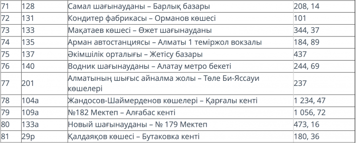 В ноябре 2017 года депутаты маслихата Алматы VI созыва утвердили тарифы для субсидирования 44 маршрутов. Тогда в профильном управлении поясняли, что стоимость перевозки одного пассажира зависит от того, сколько людей ездят на этом маршруте, стоимости автобуса и других затрат. Себестоимость проезда может меняться каждый месяц, в зависимости от пассажиропотока.