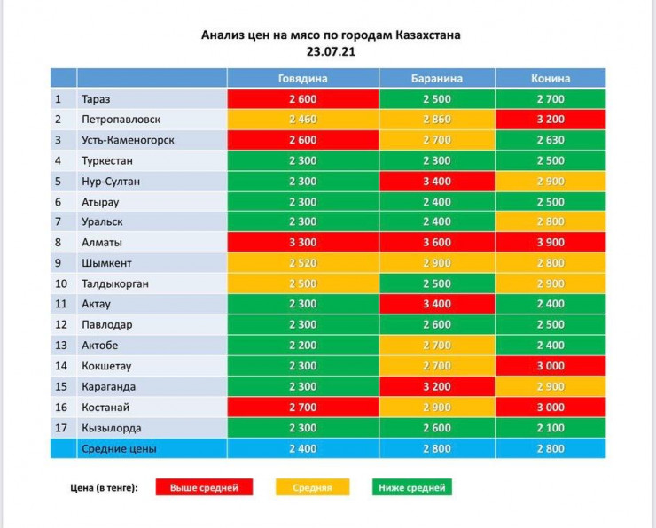 Представители партии опубликовали карту с ценами на мясо в разных городах Казахстана.