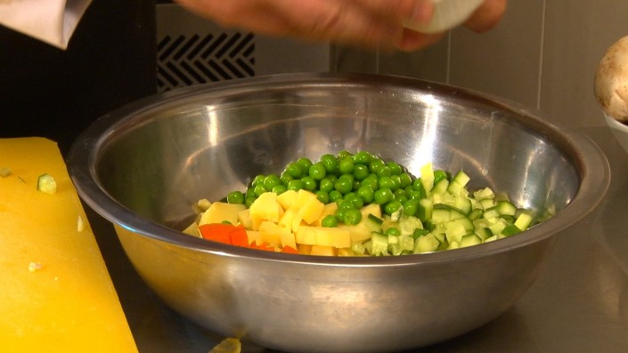 Основной ингредиент в салате - это около 200 грамм филе копченой семги. В целом, повар отмечает, что для этого блюда подойдет и любая другая соленая рыба. Все ингредиенты нарезаются небольшими кубиками, за ориентир шеф советует взять размер одного горошка, а после добавляются в емкость небольшими раздельными горстями. Это делается для того, чтобы можно было следить за пропорциональным количеством всех ингредиентов. Рыба хорошо сочетается с зеленью, поэтому шеф советует добавить немного укропа.