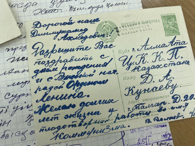 Как вспоминает племянник Диар Кунаев, дяде писали письма со всех уголков Казахстана. Много писем было от представителей казахской интеллигенции, поэтов, писателей, некоторые посвящали ему стихи: "Письма ему всю жизнь писало очень много людей, это такой большой пласт. Есть письма очень ценные - переписка с историческими личностями. Есть переписка с президентами соседних государств, с маршалами Буденным, Жуковым. Личная папка, в которой хранились его работы по горному делу. Когда он вышел на пенсию, он заказал визитки специальные, на которых было просто написано: "горный инженер".