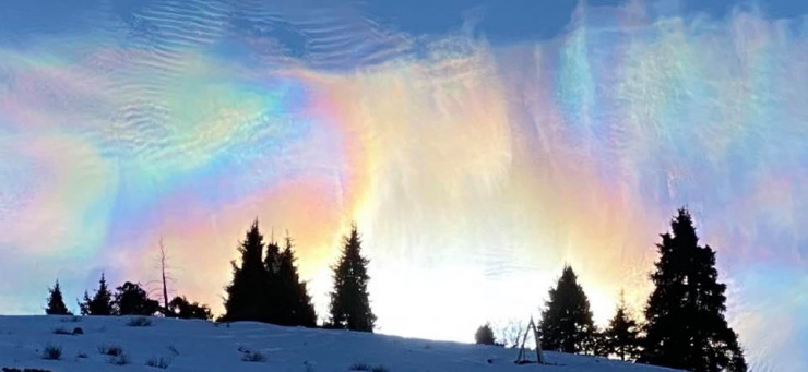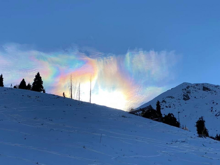 Фотографию радужных облаков опубликовала в Facebook-группе "Клуб любителей ходить в горы" пользовательница Irina Kunanbayeva. По ее словам, необычное природное явление удалось запечатлеть на горнолыжном курорте Шымбулак.
