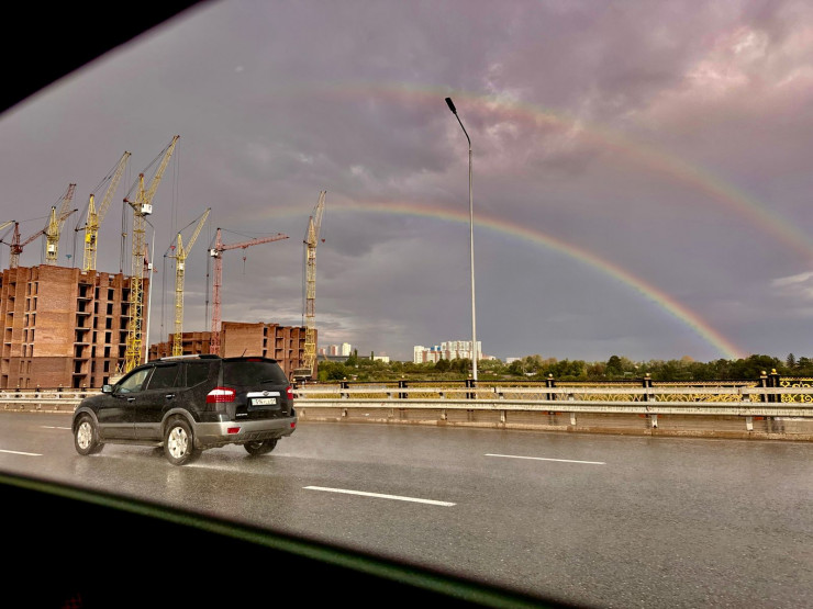После продолжительного дождя небо Астаны осветила двойная радуга. Фотограф Tengrinews.kz запечатлел редкое явление.