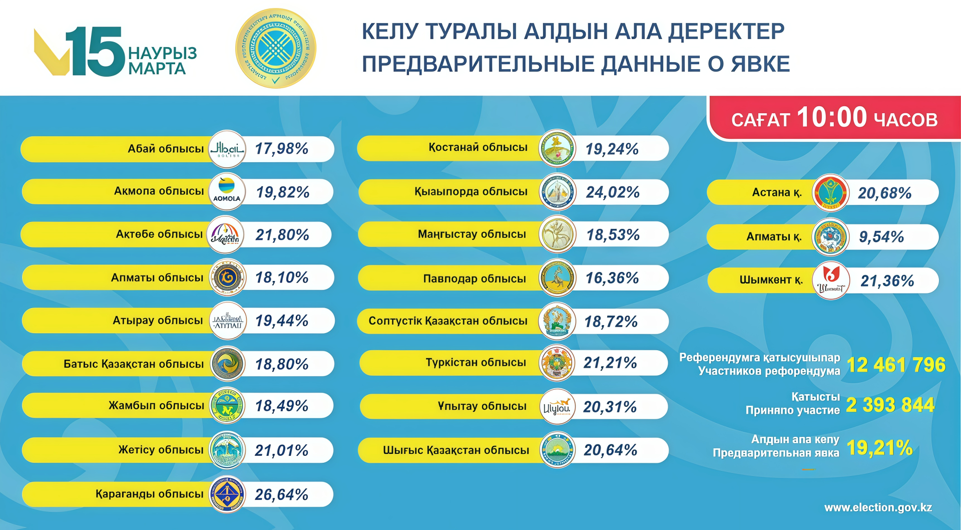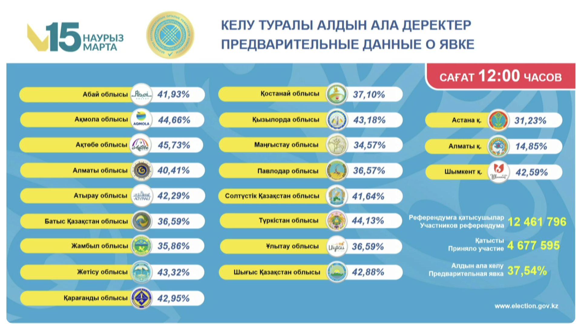 ЦИК обновил данные по явке. К 12:00 на референдуме проголосовал каждый третий казахстанец, включенный в список избирателей. В лидеры по активности вышла Актюбинская область.