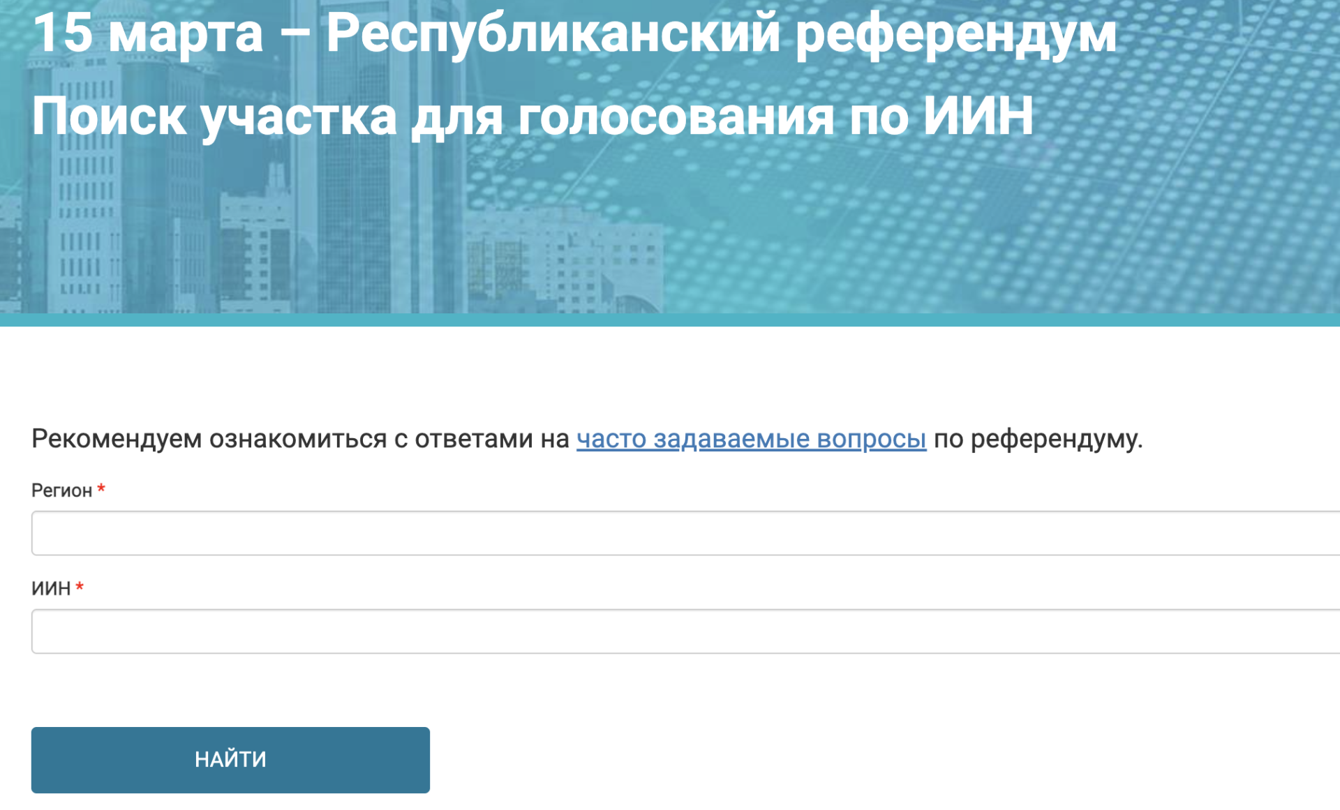 Если вы не знаете, где голосовать, свой участок можно проверить на специальном сайте referendum.gov.kz — достаточно выбрать регион и ввести ИИН. Система покажет адрес участка для голосования. Если возникнут трудности, звоните в единый контакт-центр iKomek, по телефону 109.