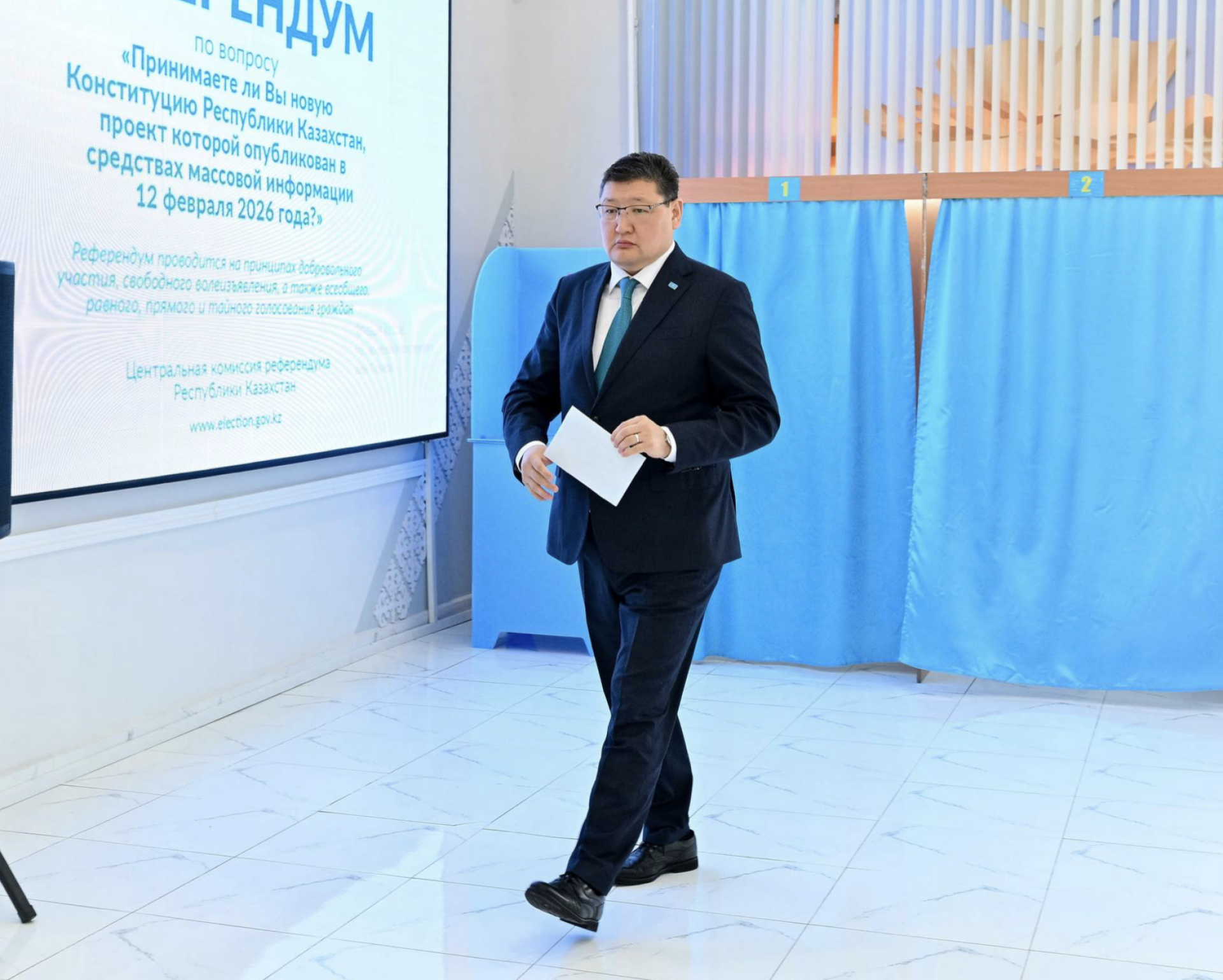 В бюллетене всего один вопрос: принимают ли граждане новую Конституцию Казахстана, опубликованную 12 февраля 2026 года. Голосовать можно только за весь документ целиком — поддержать его или отклонить.