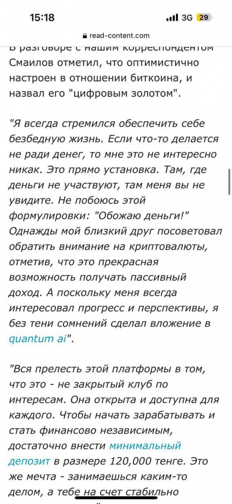 Ранее в сети распространился снимок с заместителем премьер-министра - министром финансов Еруланом Жамаубаевым. Его дизайн скопирован с портала Tengrinews.kz. Переходя по ссылке, можно попасть на некую статью с заголовком о том, что на министра подал в суд некий "Банк Казахстана". В тексте полностью выдуманного интервью рекламируется бот для торговли на криптовалютном рынке. Оригинальную запись этой передачи можно найти на YouTube. Ничего, что изложено в статье, на самом деле во время прямого эфира не происходило. Подробнее об этом можете прочитать здесь.
