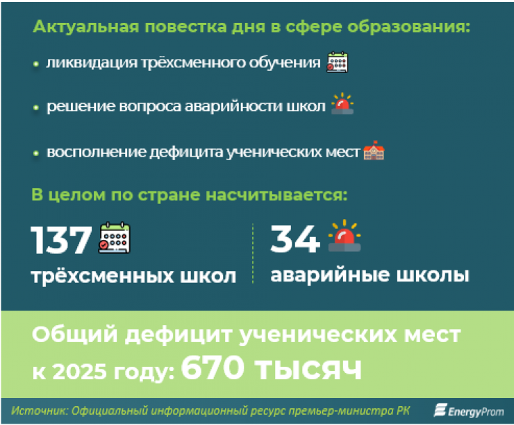 По данным МОН, в Казахстане сегодня функционируют 7429 школ, в которых обучается порядка 3,4 миллиона учеников. Из них 137 школ - трехсменные, еще 34 школы находятся в аварийном состоянии, говорится на официальном ресурсе премьер-министра.