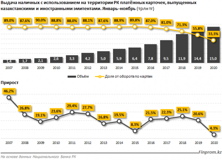 Отмечается, что почти 92 процента объема средств, обналиченных с платежных карт в стране за январь – ноябрь 2020 года, приходится на банкоматы: 13,7 триллиона тенге. Это на 11,5 процента больше, чем в 2019 году. Количество транзакций при этом сократилось на 7,4 процента до 272,2 миллиона тенге. Это увеличило средний чек одного обналичивающего действия через банкомат с 41,9 тысячи до 50,5 тысячи тенге.