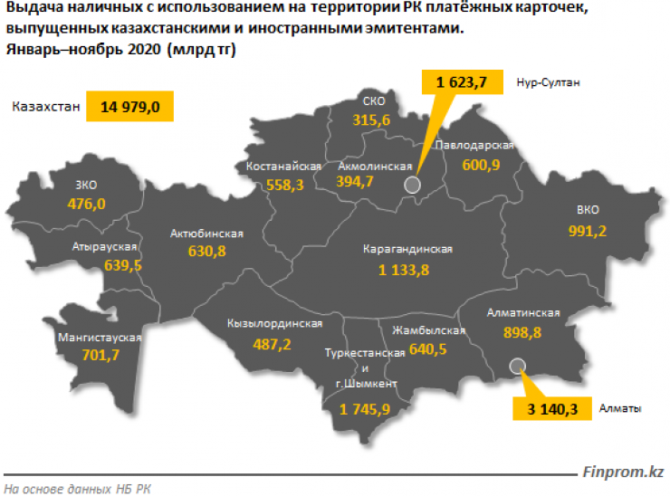 Чуть менее трети обналиченных средств приходится лишь на Алматы (3,1 триллиона тенге) и Нур-Султан (1,6 триллиона тенге).