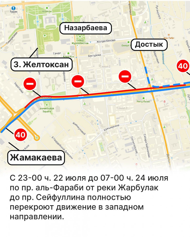 - С 23:00 22 июля до 7:00 часа 24 июля проезд с проспекта Достык, проспекта Назарбаева, бульвара Мендыкулова и улицы Западный Желтоксан на проспект аль-Фараби в западном направлении будет ограничен. Объезд будет организован по проспекту Достык, улице Сатпаева и проспекту Сейфуллина.