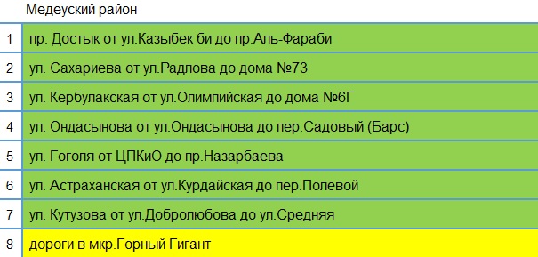 В Медеуском районе отказались от ремонта на двух улицах: Турксибской от улицы Оспанова до дома № 52 и Олимпийской от улицы Олимпийской до Тышканбаева. Дороги в микрорайон Горный гигант все еще перекрыты.
