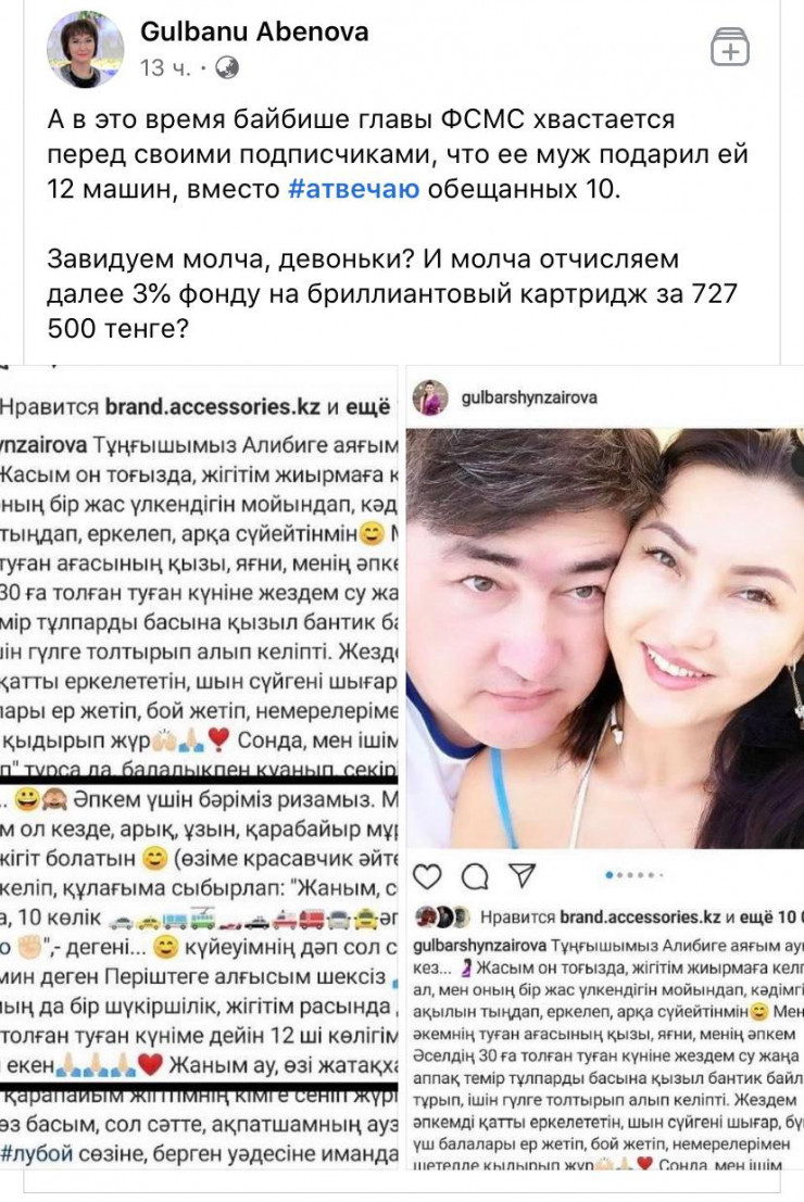 Қоғам белсендісі Гүлбану Әбенова Facebook желісіндегі парақшасында медициналық сақтандыру қоры басшысы Айбатыр Жұмағұловтың жарының жеке аккаунтындағы жазбаны бөлісті.
