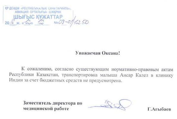 Отметим, что клиника находится в городе Ченнай в 2 200 километрах от Дели. Усенов выяснил, что выделить санавиацию для ребенка может только специально созданная коллегия под председательством премьер-министра Казахстана. По словам отца мальчика, в Казахстане не было практики, когда из страны за рубеж санавиацией транспортировали больного ребенка.