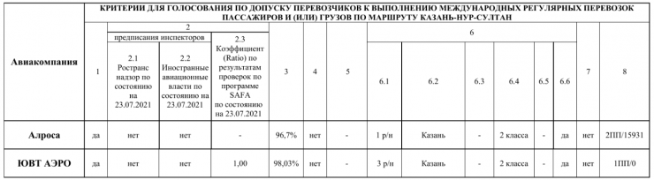 Росавиация готовит запуск авиарейса Казань - Нур-Султан. На прошлой неделе Федеральное агентство воздушного транспорта России (Росавиация) опубликовало оценочный лист на допуск авиакомпаний "Алроса" и "ЮВТ Аэро" к осуществлению рейсов из Татарстана в Казахстан. Авиакомпании оценили на предмет регулярности рейсов и соответствие требованиям международных перевозок.