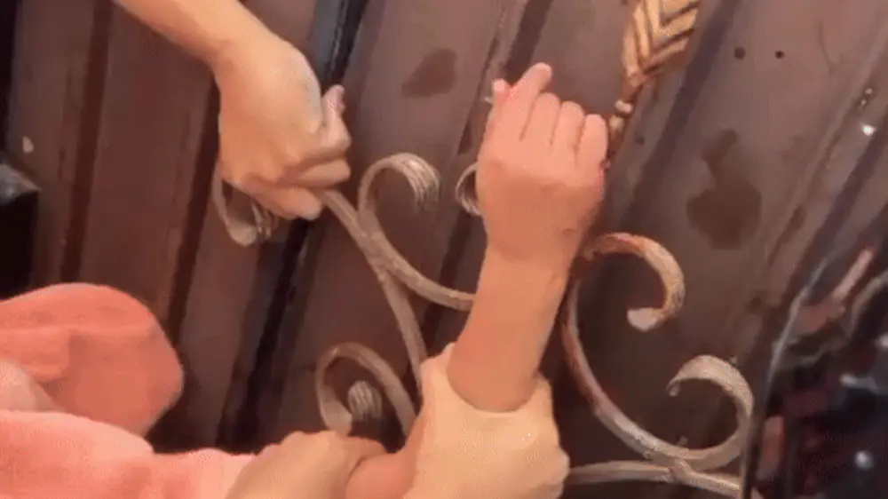 На кадрах видно, как девочку вместе с частью металлического забора передают медикам.