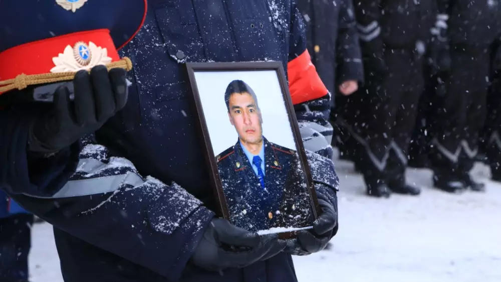 В Костанайской области простились с погибшим полицейским Дарханом Базарбаевым, передает корреспондент Tengrinews.kz.