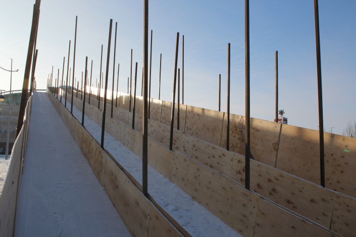 Она изготовлена из металлоконструкции. Поверхность скольжения - скатов горки выполнена из многослойных листов фанеры. Общая площадь застройки 160 квадратных метров. Строительством горки занимается частное лицо.