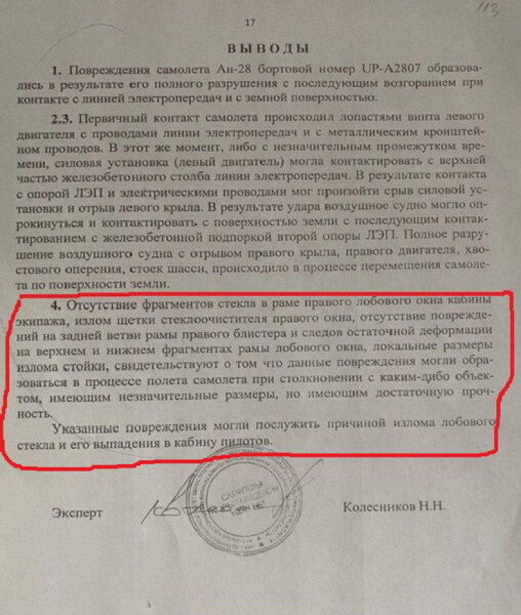 Кроме того, отец погибшего летчика Евгения Кутафина считает, что самолет могли обстрелять с земли. Маршрут Ан-28 проходил прямо над военным полигоном. Газета "Время" опубликовала документ, который может это подтвердить. В нем говорится, что лобовое окно кабины самолета было выбито. Характер повреждений говорит о том, что якобы самолет столкнулся с незначительным по размеру, "но имеющим достаточную прочность" объектом.