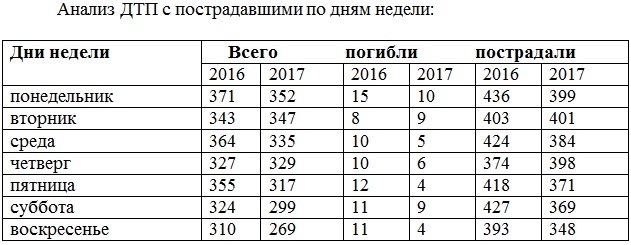 Согласно анализу ДТП с пострадавшими по дням недели, наиболее аварийным за последние два года является понедельник. На этот день недели приходится не только наибольшее количество аварий, но число жертв и пострадавших. Согласно статистике, наименее аварийный день недели - воскресенье.