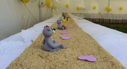 Для того, чтобы угостить всех детей тортом, организаторы праздника установили большой шатер. 30-метровый медовик весом в 225 килограммов готовили всего два кулинара столичного кондитерского цеха. Всю минувшую ночь мастера выпекали коржи: ушло 40 килограммов муки, более 500 яиц, 25 килограммов сахара и пять килограммов меда. Для оформления торта было сделано 60 фигурок сказочных персонажей из цветного сахара.